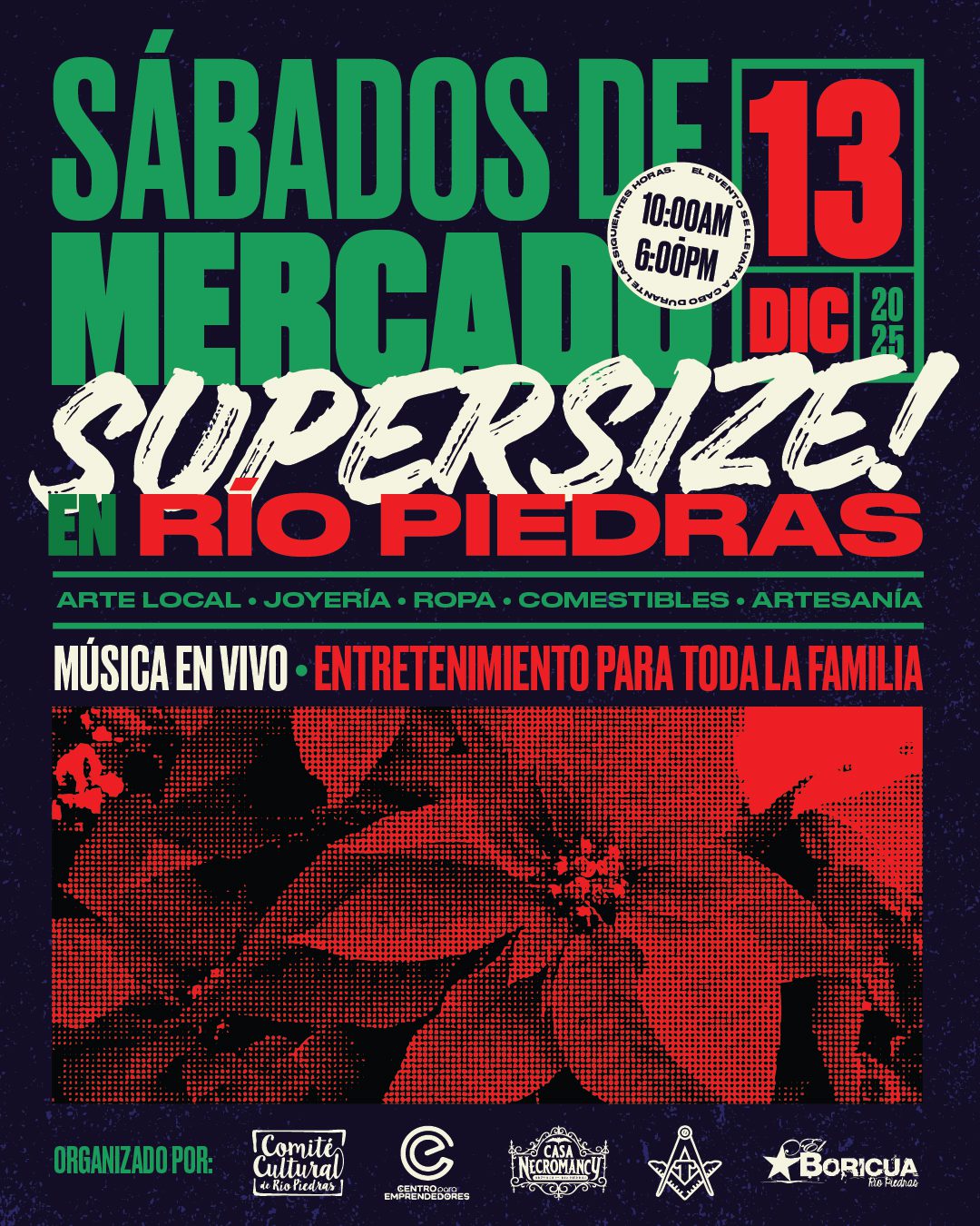 El Centro Para Emprendedores se une a la Junta Comunitaria de Río Piedras y Casa Necromancy para llevar a cabo el Sábado de Mercado Navideño el sábado, 13 de diciembre, de 10:00 a.m. a 6:00 p.m. en la Plaza de la Convalecencia, el Paseo De Diego, la calle del Carmen y la calle Saldaña. El mercado contará con más de 200 emprendedores que ofrecerán una variedad de productos, incluyendo artesanías, productos y servicios diversos, libros de autores locales, postres, plantas y mucho más. Le recordamos al público en general que puede llegar al mercado a través del Tren Urbano, bajándose en la estación de Río Piedras, o utilizar el estacionamiento soterrado del Municipio, debajo de la Plaza de la Convalecencia.
