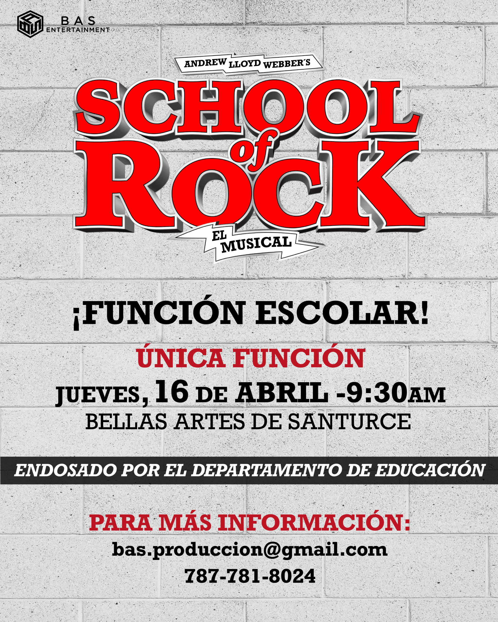 BAS Entertainment anunció hoy que presentará una función escolar de School of Rock: El Musical el 16 de abril en la Sala de Festivales del Centro de Bellas Artes de Santurce. Esta iniciativa busca acercar a los estudiantes al teatro musical a través de una experiencia educativa, energética y profundamente inspiradora.