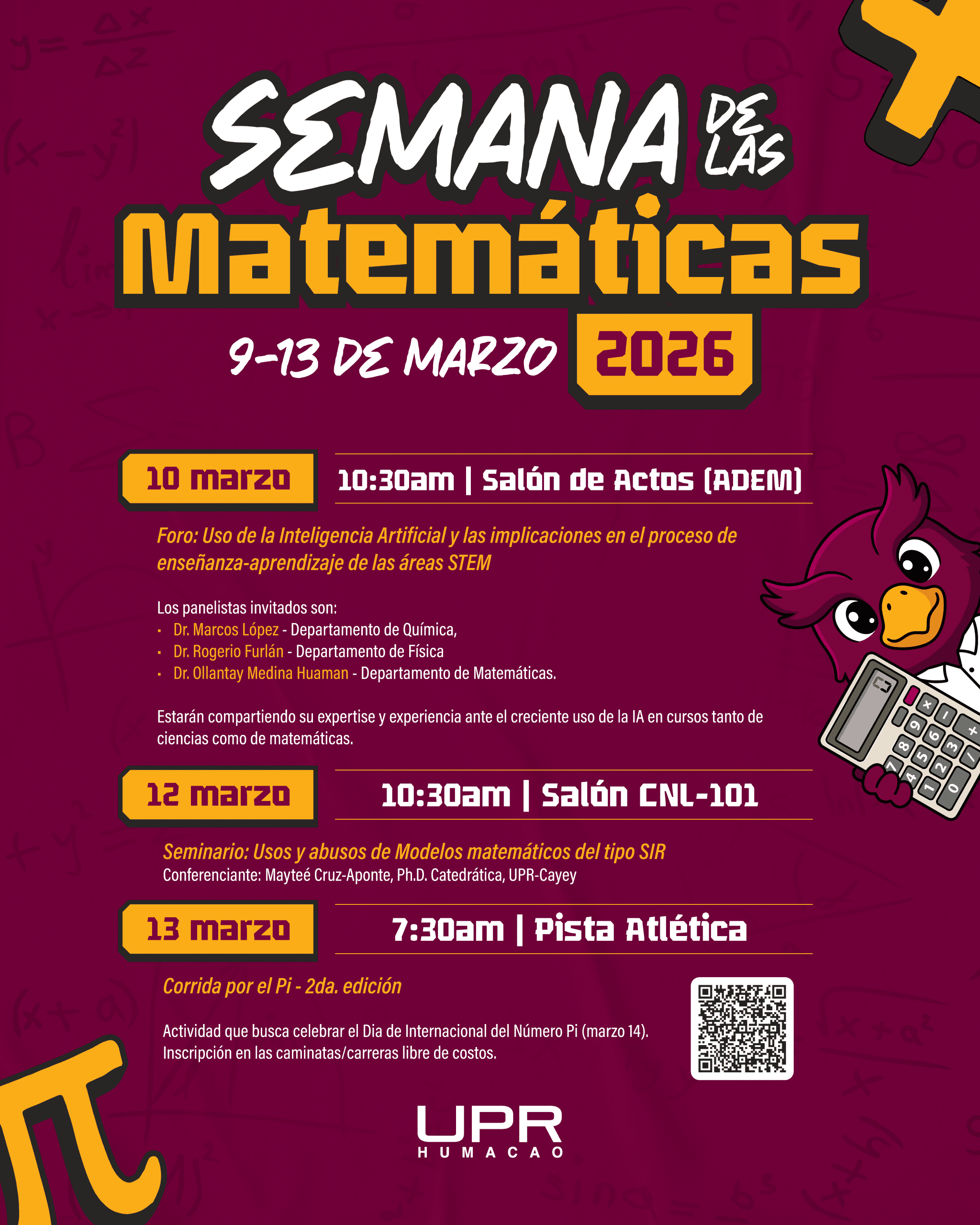 El Departamento de Matemáticas de la Universidad de Puerto Rico en Humacao (UPRH) celebrará del 9 al 13 de marzo de 2026 la Semana de las Matemáticas, una iniciativa académica dirigida a fomentar el análisis, la reflexión y el entusiasmo por esta disciplina esencial en las áreas STEM (Ciencia, Tecnología, Ingeniería y Matemáticas).