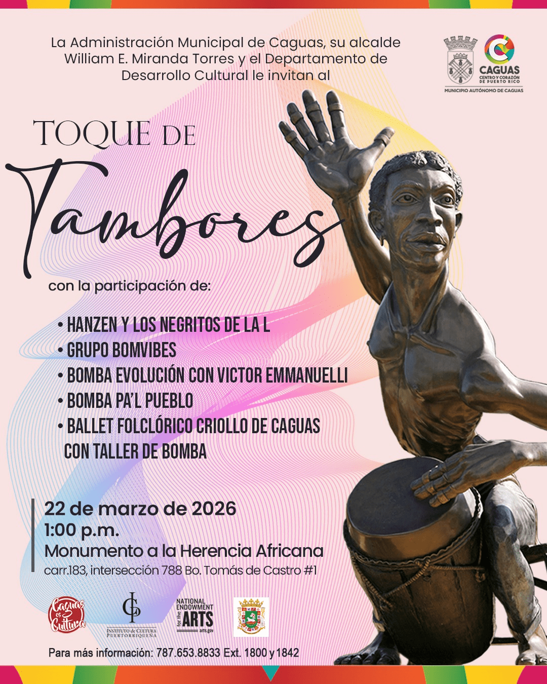 La Administración Municipal de Caguas, su alcalde William Miranda Torres, y el Departamento de Desarrollo Cultural llevarán a cabo esta tradicional actividad el domingo, 22 de marzo de 2026, desde la 1:00 p.m., en el Monumento a la Herencia Africana, ubicado en la carretera 183 intersección 788 en el barrio Tomás de Castro #1.