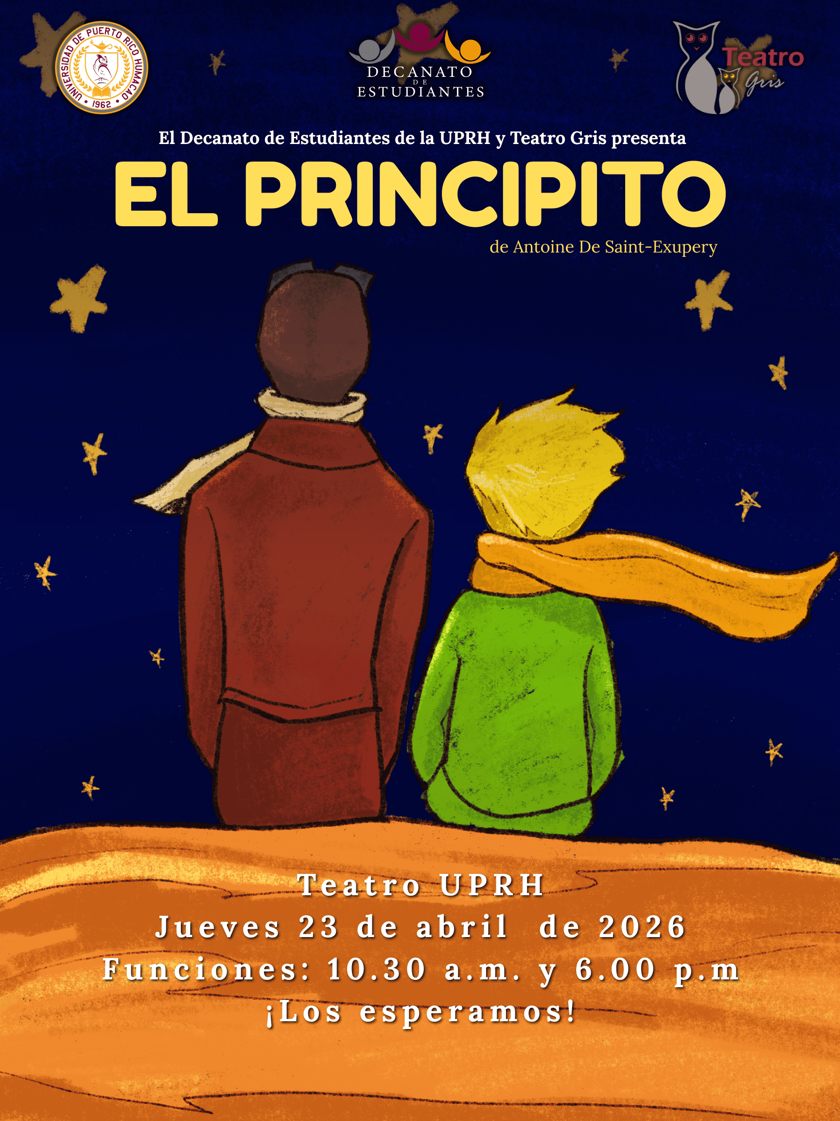 La agrupación artística estudiantil Teatro Gris de la Universidad de Puerto Rico en Humacao (UPRH) presentará la reconocida obra El Principito, del autor francés Antoine de Saint-Exupéry, el jueves, 23 de abril de 2026, en funciones a las 10:30 a.m. y 6:00 p.m., en el Teatro de la institución. Ambas funciones serán libres de costo.