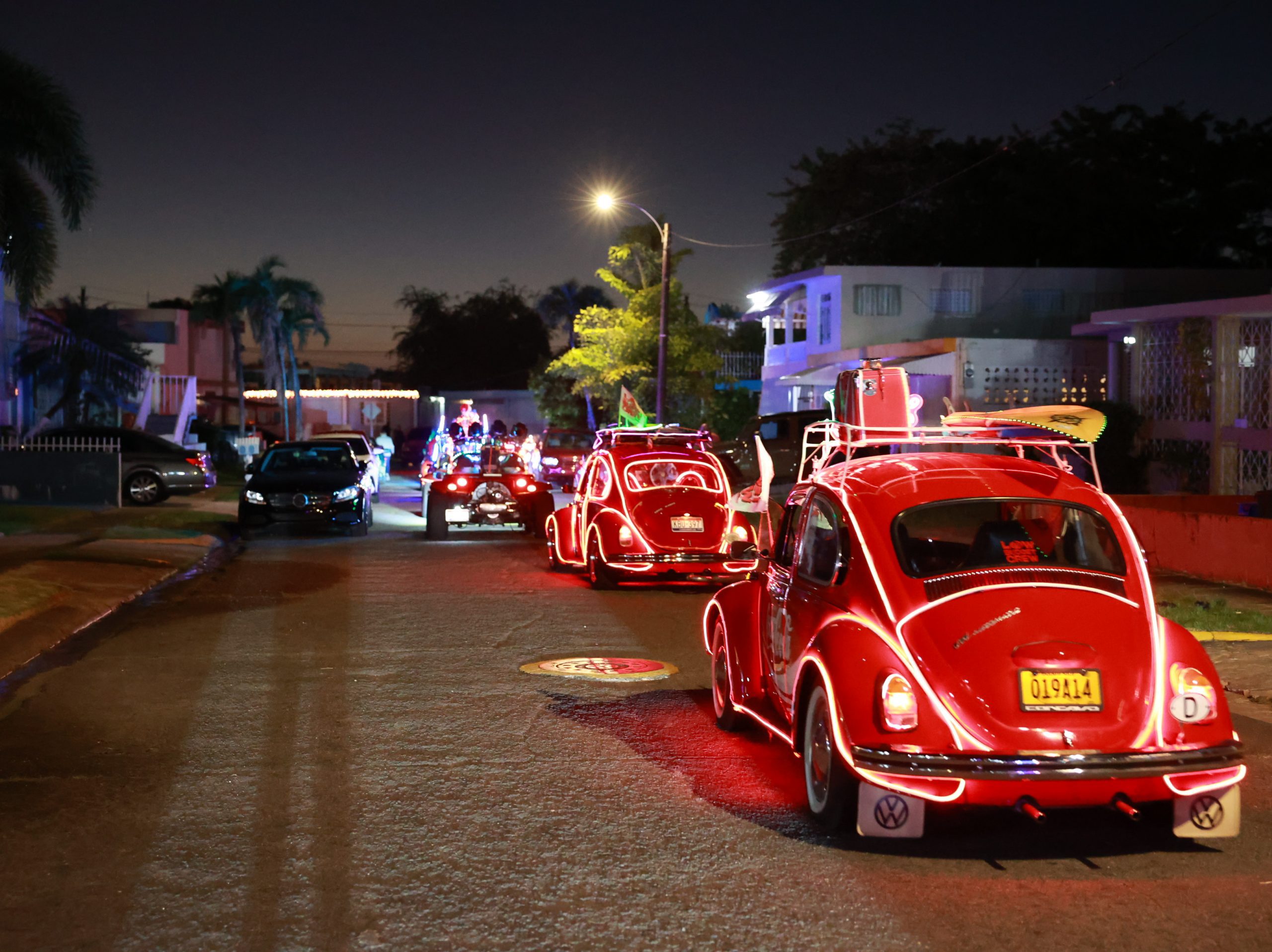 La caravana Gigante estuvo escoltada por unos pintorescos volkys iluminados pertenecientes al club aficionado “Low Budget Crew” de Carolina. Asimismo, Aponte estuvo acompañado de pleneros, personajes infantiles y gran un despliegue de las unidades de la gerencia de seguridad y de servicios del ayuntamiento.